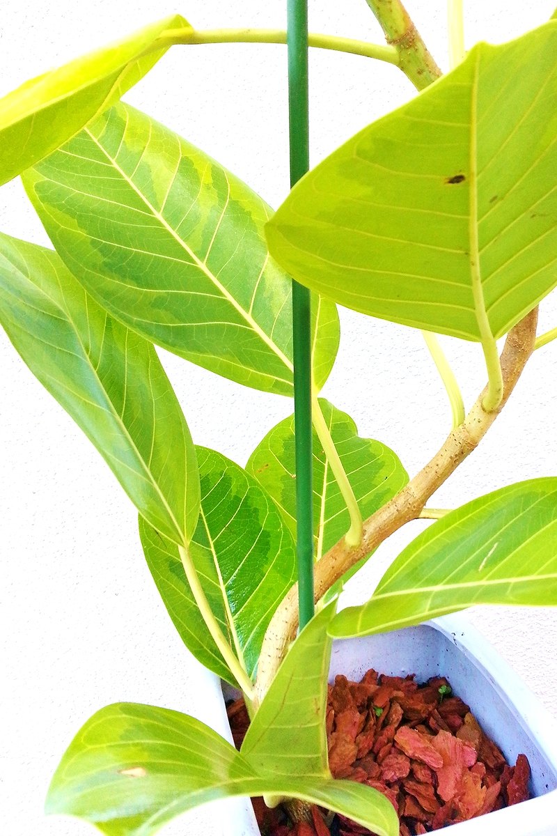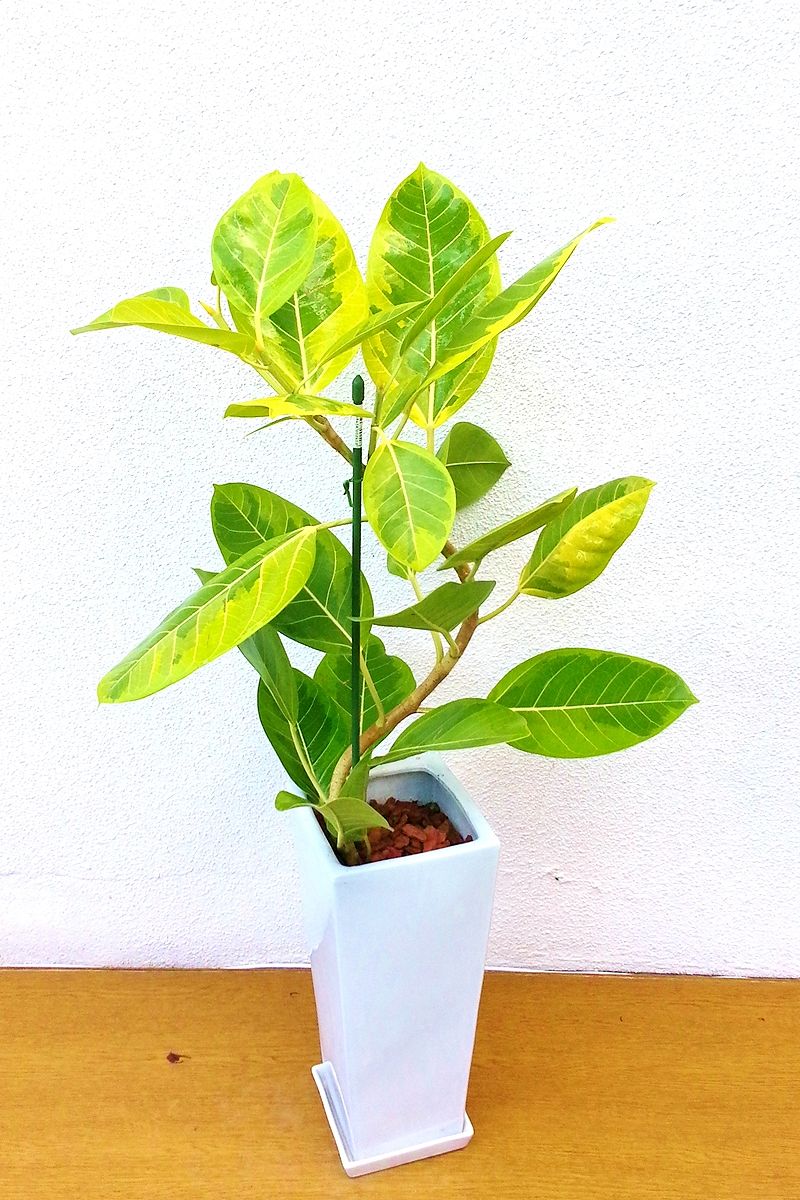 葉縁に鮮やかな黄斑が入り、葉脈も黄色で浮き出るつやのある大きな葉っぱが魅力的な観葉植物です。