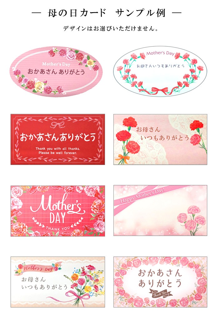 メッセージカードの母の日カードは、ご指定のない場合は『例(お母さん、いつもありがとう)』などの内容になります。